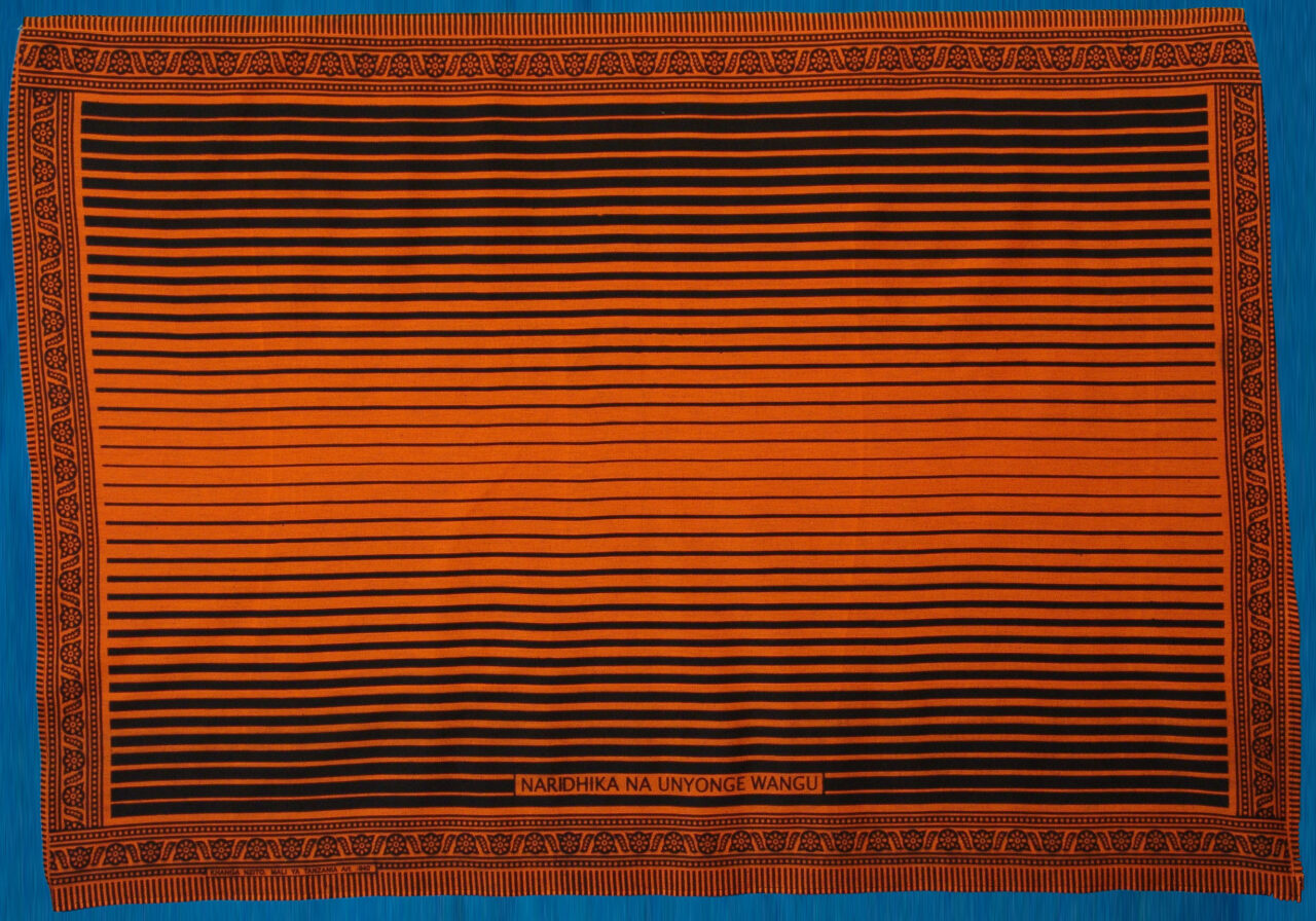 Industriais, Kangas, Tecidos AL_TZ_TCI_17 DescriçãoKanga. Tecido industrial. Zanzibar, Suaíli. Algodão. Inscrito: NARIDHIKA NA UNYONGE WANGU (ESTOU SATISFEITO COM MINHA HUMILIAÇÃ). Na barra, em letras menores: KANGA NZITO. MALI YA TANZANIA ART 940 (UM ENVOLTÓRIO PESADO. PROPRIEDADE DA TANZÂNIA ART 940).Medidascomp. 105 cm x larg. 142 cmRegião/PaísÁfrica do Leste | TanzâniaUso/FunçãoIndustriais | Kangas | TecidosTécnica/MaterialIndustrial Compartilhar Item anteriorAL_TZ_TCI_16 Próximo itemAL_TZ_TCI_18