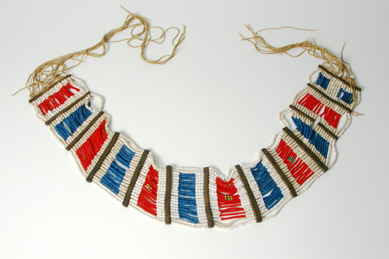 Cintos, Vestuário AL_TZ_VES_04 DescriçãoCinto de miçangas e metal com fios de fibra vegetal.Medidascomp. 81 x larg. 12 cmRegião/PaísÁfrica do Leste | TanzâniaGrupo CulturalWanyaturuUso/FunçãoCintos | Vestuário Compartilhar Item anteriorAL_TZ_VES_03 Próximo itemAL_UG_ADN_01